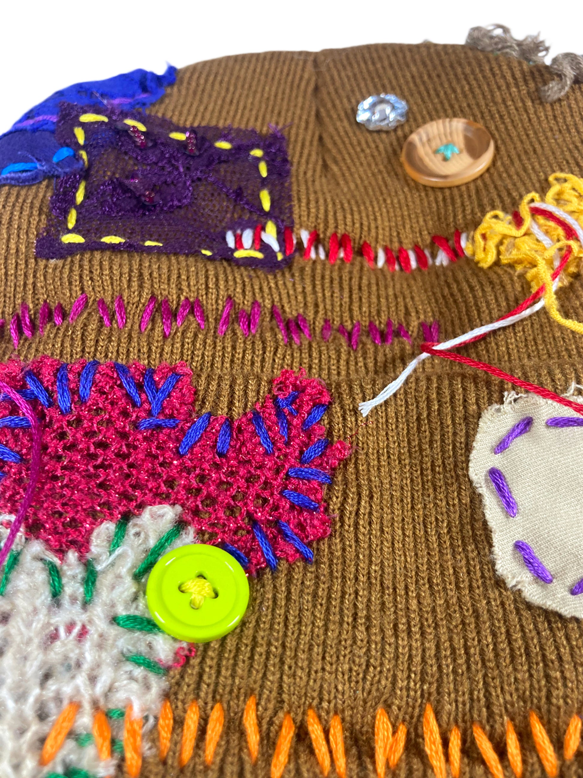 • Various colored knits, twill, velvet, corduroy, denim & lace patchwork on brown 100% acrylic mimicking centuries-old mending/decorative techniques